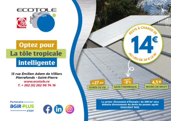 ECOTOLE fondée en 2008, est dans l’Océan Indien, la plateforme de la société Ondulit, qui développe une large gamme de solutions répondant à toute exigence technique et esthétique. Nous sommes spécialisés dans les toitures et bardages performants et fabriquons des produits qui facilitent et apportent les performances demandées par la règlementation thermique et acoustique (RTAA DOM). Nos unités de production des tôles se trouvent à La Réunion.